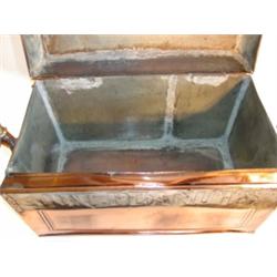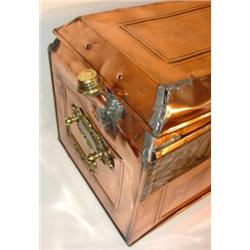 PRIMITIVE COPPER PEANUT ROASTER. Brass handles on sides and knob on top. Marked on front "Hot Peanuts". Shows signs of wear and denting. 10" H, 18" W, 9.75" D