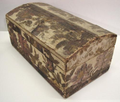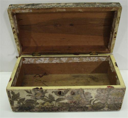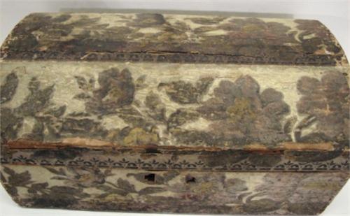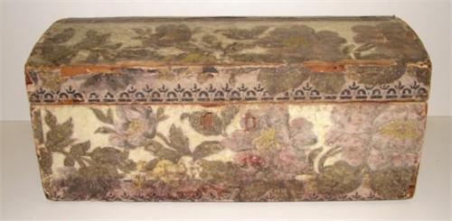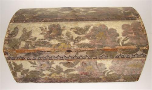 PRIMITIVE DOCUMENT BOX. Dome lid. Box is decorated with wall paper on exterior. Box shows signs of wear and some splitting. 8” H, 17.75” W, 9.75” D