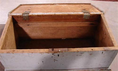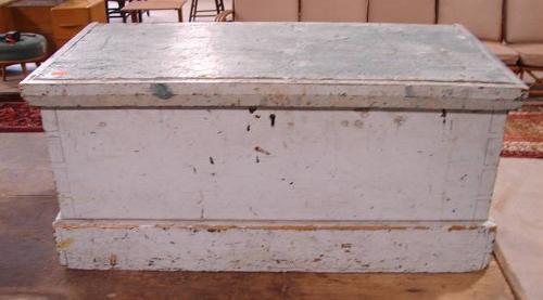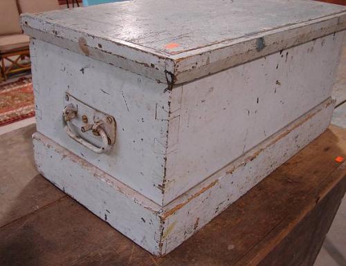 PRIMITIVE DOVETAILED TOOL CHEST. Retains light blue original paint. Iron handles at both sides. Shows loss to paint at areas. 11.75” H, 25.25” W, 12.5” D