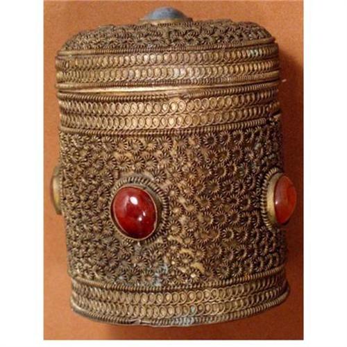 I can?t even imagine the days or weeks it takes to make something with so much hand wrought Etruscan metal work. It is truly a lost art. IT looks like intricate metal lace everywhere!/ The stones are genuine carnelian and the design is just awesome!. This is NOT a new piece and it has aged gracefully with dark patina. There has to be at least a thousand little spirals on this , not to mention the edgings. This is about 4" tall and 3" wide. The lid closes and stay on fine. I am not sure of the metal content, but it is heavy.