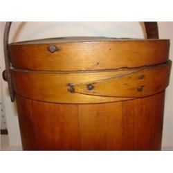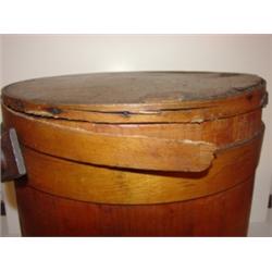 PRIMITIVE FIRKIN WITH HANDLE. Looseness to wood around top edge of lid. 16.5" H