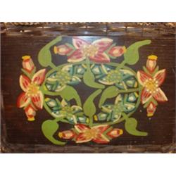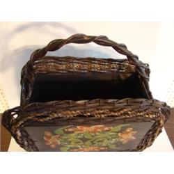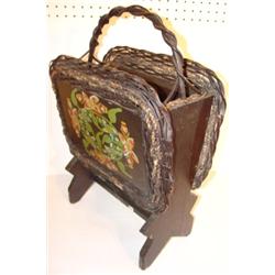 PRIMITIVE FOLK ART MAGAZINE RACK with handle. Painted floral decoration on both sides. Wooden base with wicker and rope decorated sides. 22" H, 7.75" W, 13.5" L