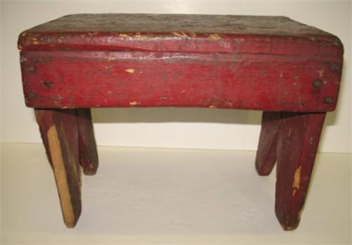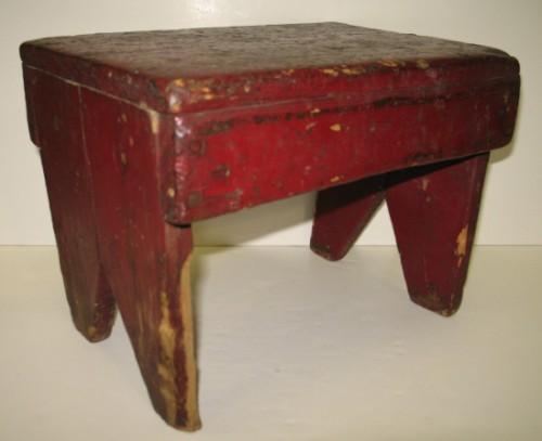 PRIMITIVE FOOT STOOL. Retains original red paint with some loss. Boot jack feet. 9.75” H, 13.25” L, 9.25” W