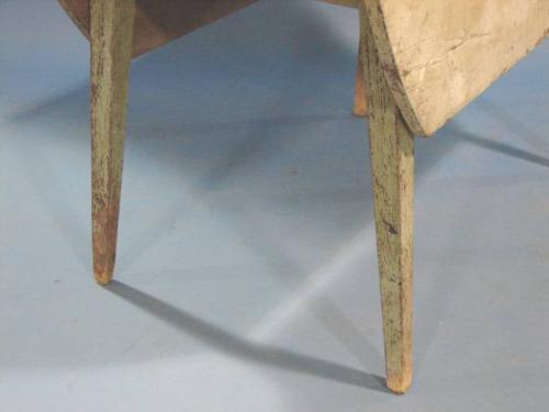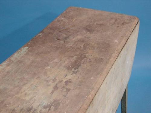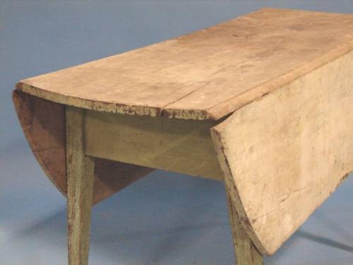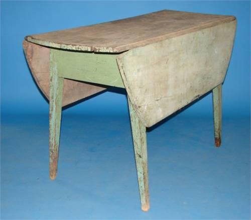 PRIMITIVE GREEN PAINTED FARM TABLE. Drop leaves. Retains original green paint. Tapered legs. Pegged construction. Shows major signs of wear and loss to paint. Excessive wear at top. 29" H, 48" L, 19" W. Each leaf: 13" W