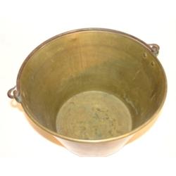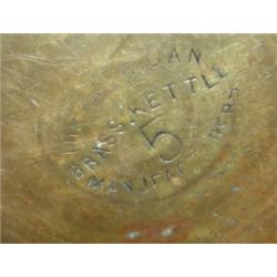 PRIMITIVE HANDLED BRASS BUCKET. Marked on bottom "The American Manufacturers-Brass Kettle-5". 9" H, 12.75" Dia.