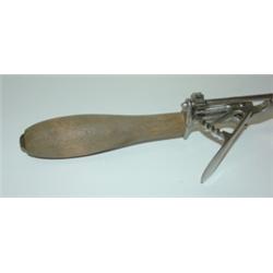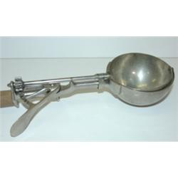 PRIMITIVE ICE CREAM SCOOP. Marked with "8" on inside of bowl. Wooden handle. 11.25" L