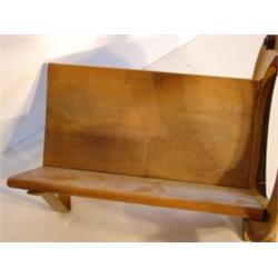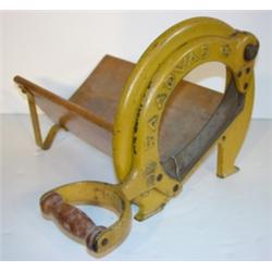 PRIMITIVE MEAT SLICER. Original yellow paint. Marked on end of slicer "Raadvad" with crowns. Wooden handle and rest. 10" H, 12.25" L