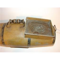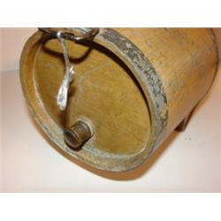 PRIMITIVE METAL WARE HANDLED KEG. Body is painted to resemble wooden keg. Spout on end. Strainer on top. Shows signs of loss to paint throughout. Good overall condition. 19.75" L