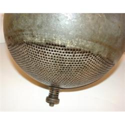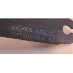 PRIMITIVE METALWARE HANDLED STRAINER. Handle is marked "Dilver Mfg. Co.-Pittsburgh, Pa." Rotator is marked with swastika Dilver logo. 14.75" L