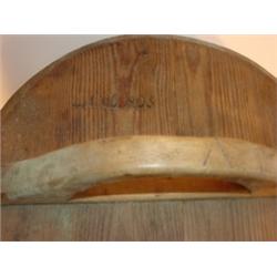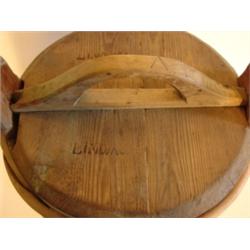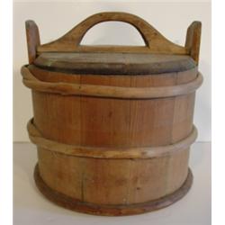 PRIMITIVE PINE BUCKET WITH LIFT TOP. Lid is marked "LIND.AOS". Marked on side "EPS". 11.5" H, 11" Dia.