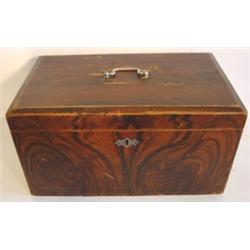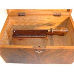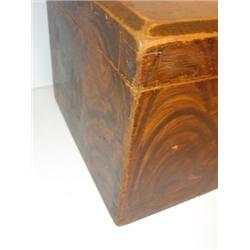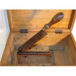 PRIMITIVE PINE GRAIN PAINTED SUGAR BOX. Original cutter on inside. Original hinges and lock. Dovetailed construction. 8.5" H, 16" W, 10" D