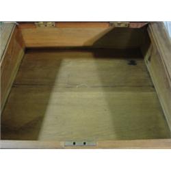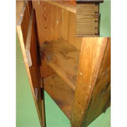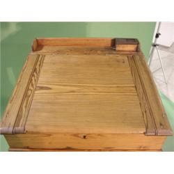 PRIMITIVE PINE POSTMASTER'S DESK. Dovetailed construction on corners. Lift-top. Original lock and hinges. Hinged door on reverse side with two shelves. Inkwell on top. 44" H, 25" W, 24" D