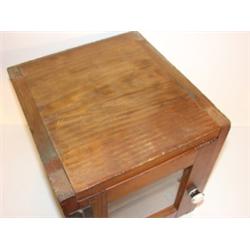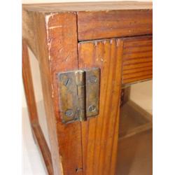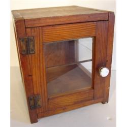 PRIMITIVE PINE STORE DISPLAY CASE. Glass panes on both sides and glass pane in door. One glass shelf. White porcelain knob on door. Original hinges on door. 11" H, 9.5" W, 10.5" D