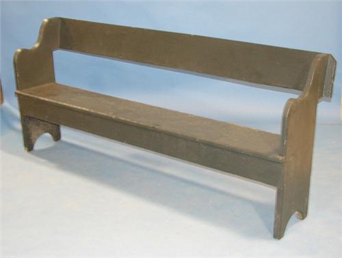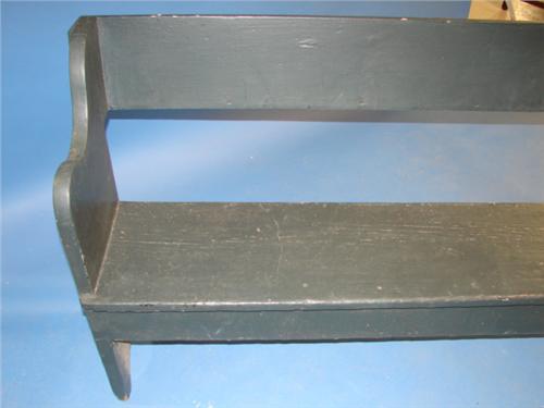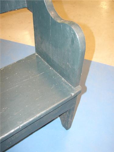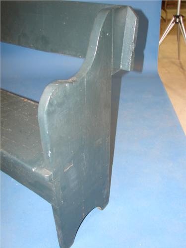 PRIMITIVE PORCH BENCH. Mortis & dovetailed construction. Cut-out feet. Single board seat. Overpainted. 34.5” H, 81” L, 13.5” D