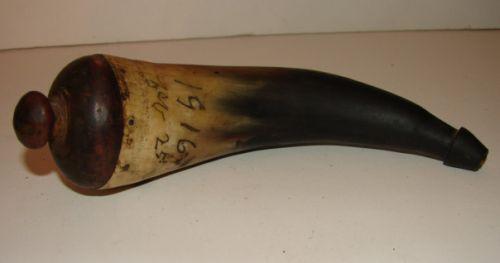 PRIMITIVE WORLD WAR I ERA TUSK POWDER HORN. Inscribed “1916/Feb 25”. Wooden lid. 7” L