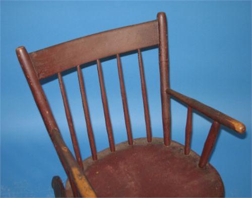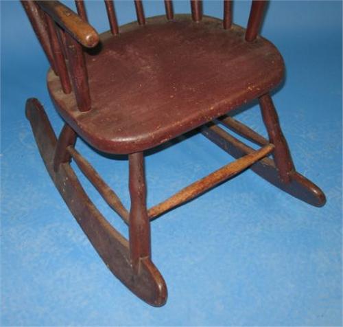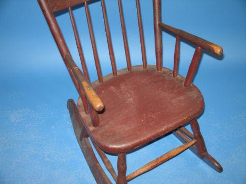PRIMITIVE RED PAINTED ARMED ROCKING CHAIR. Large sleigh style rockers at feet. Shows signs of wear. 30.5” H to top of back, 19.5” W, 16.25” H to top of seat.