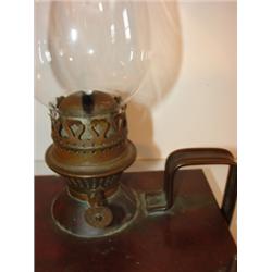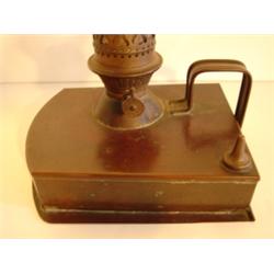 PRIMITIVE OIL SHIP'S TABLE LAMP. Tin ware. Rectangular base. Marked on burner knob "Seahorse". Marked on oil cap "Wm. McGeoch & Co. Ltd." 12.75" H to top of chimney. Base: 8" x 6"