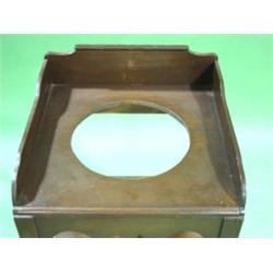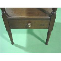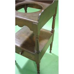 PRIMITIVE SINGLE DRAWER WASHSTAND with splash back and cut-out for wash bowl. Single dovetailed drawer in bottom. Replaced knob on drawer. 35" H, 17.25" W, 17.25" D