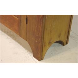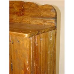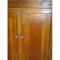 Primitive softwood 2 door jelly cupboard. Has 2 raised panel doors on front, galley on top of back, good overall condition. Has recently been refinished. 60" H, 49" W, 12.5" D