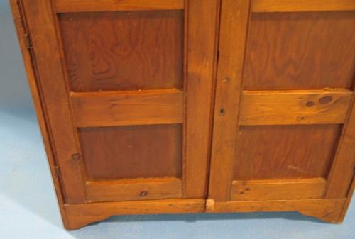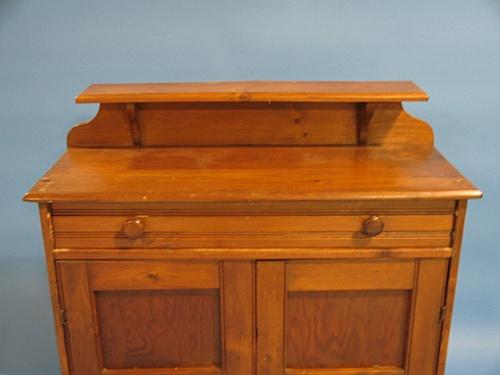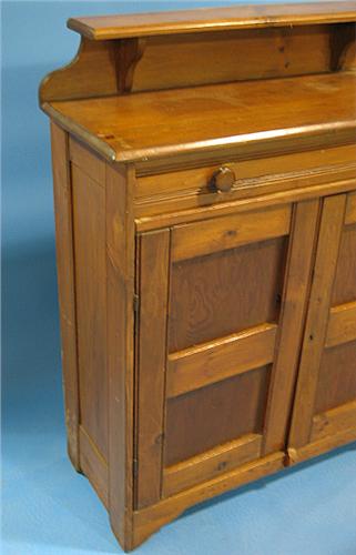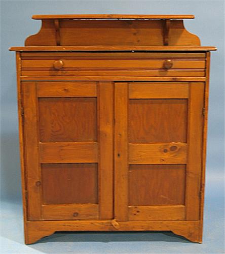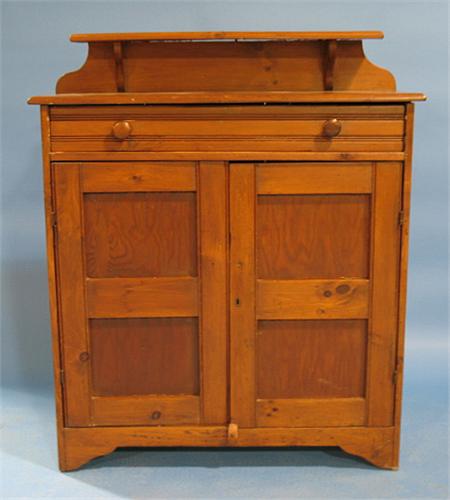 PRIMITIVE SOFTWOOD JELLY CUPBOARD. Single drawer at top over two blind doors. Has galley at top. Bracket feet. Shows signs of surface scratching and wear. 45" H, 37.5" W, 15" D