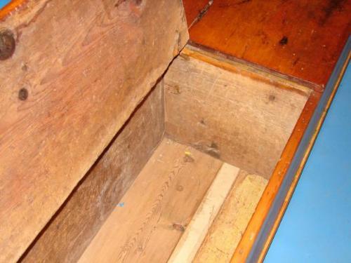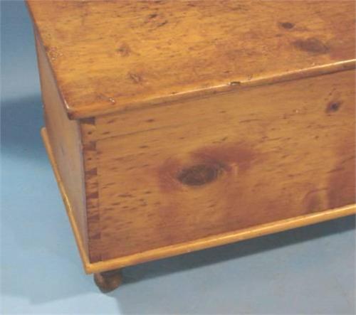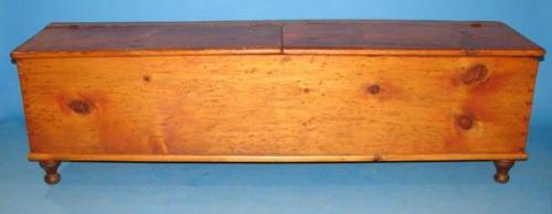 PRIMITIVE SOFTWOOD WOOD CHEST. Dovetailed construction. Turned feet. Has two lift tops. 21" H, 72" L, 18" D