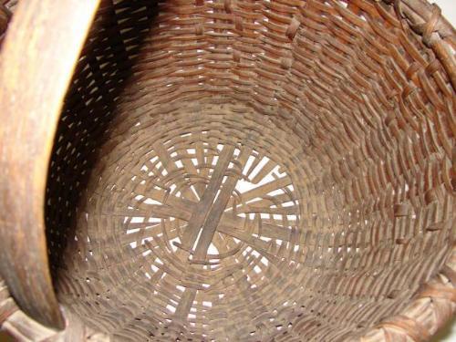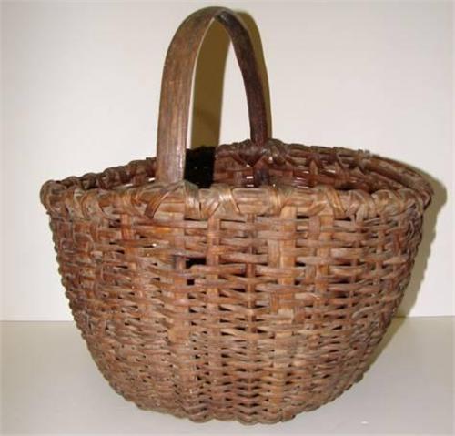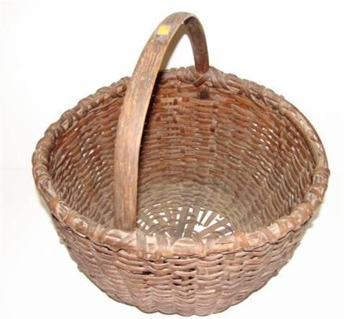 PRIMITIVE SPLINT OAK BASKET WITH HANDLE. Shows some loss to wood at areas of weave. 16" H