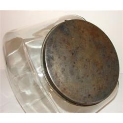 PRIMITIVE STORE CANDY JAR. Tin lid. Glass body. No mark. 10" H