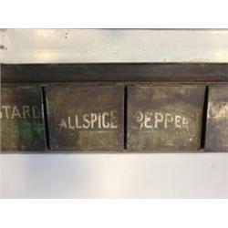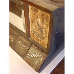 PRIMITIVE TIN STORE SPICE DISPLAY. Display has beveled mirror middle with painted heron decorations on sides of mirror. Features compartments for ginger, mustard, all spice, pepper, cinnamon, & cloves. Severe rusting. Minimal dents. 13.75" H, 27.5" W, 12" D