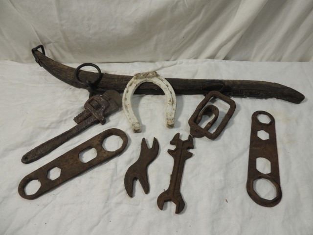 HORSE HAMES, HORSESHOE HORSE SHOE, AND MANY PRIMITIVE TOOLS AS SHOWN. ALL FOR ONE MONEY.
