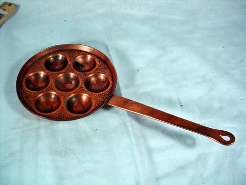 PRIMITIVE VINTAGE COPPER EGG POACHER 5.75" WITH RIVETED HANDLE (12" WITH HANDLE)