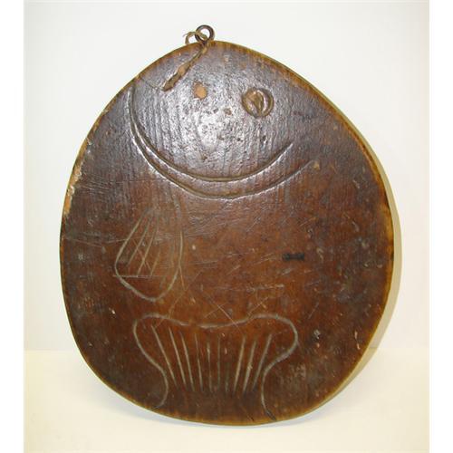PRIMITIVE WOODEN CUTTING BOARD. Incised decoration. Has been converted in wall plaque. 11.25” L, 9.75” W