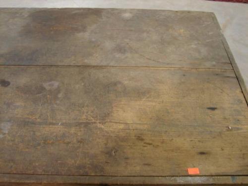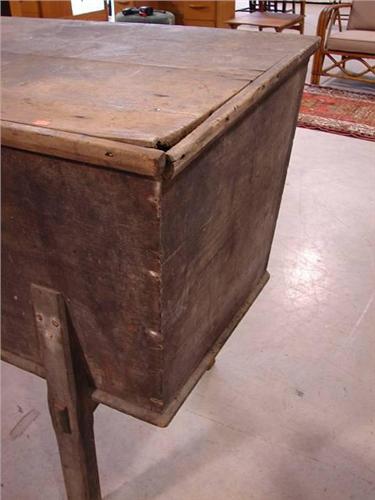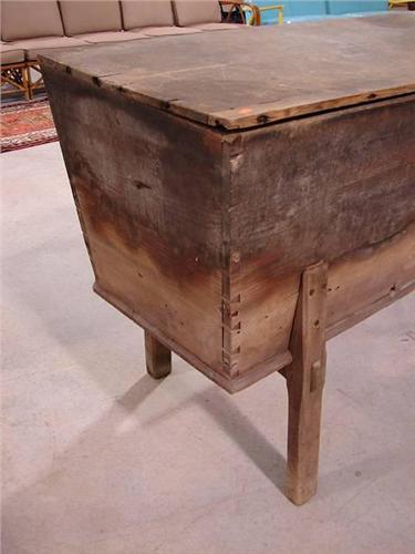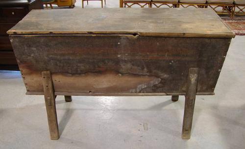 PRIMITIVE WOODEN FEED BOX. Lift top. Dovetailed case. Mortis & tendon legs. Shows extreme signs of wear. Has two board lid. 37” H, 62.25” W, 24” D