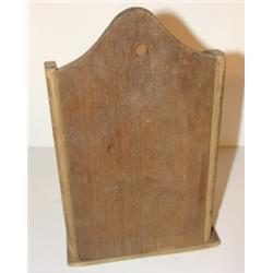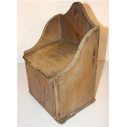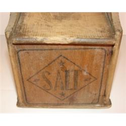 PRIMITIVE WOODEN SALT BOX. Marked "Salt" on front. Wall mounted. 9" H, 5.75" W, 4.5" D