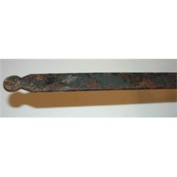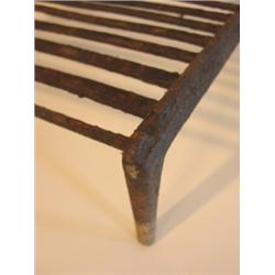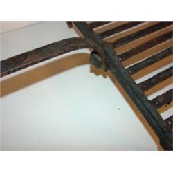 PRIMITIVE WROUGHT IRON GRILL WITH HANDLE. Shows signs of corrosion and loss to paint. 21.5" L
