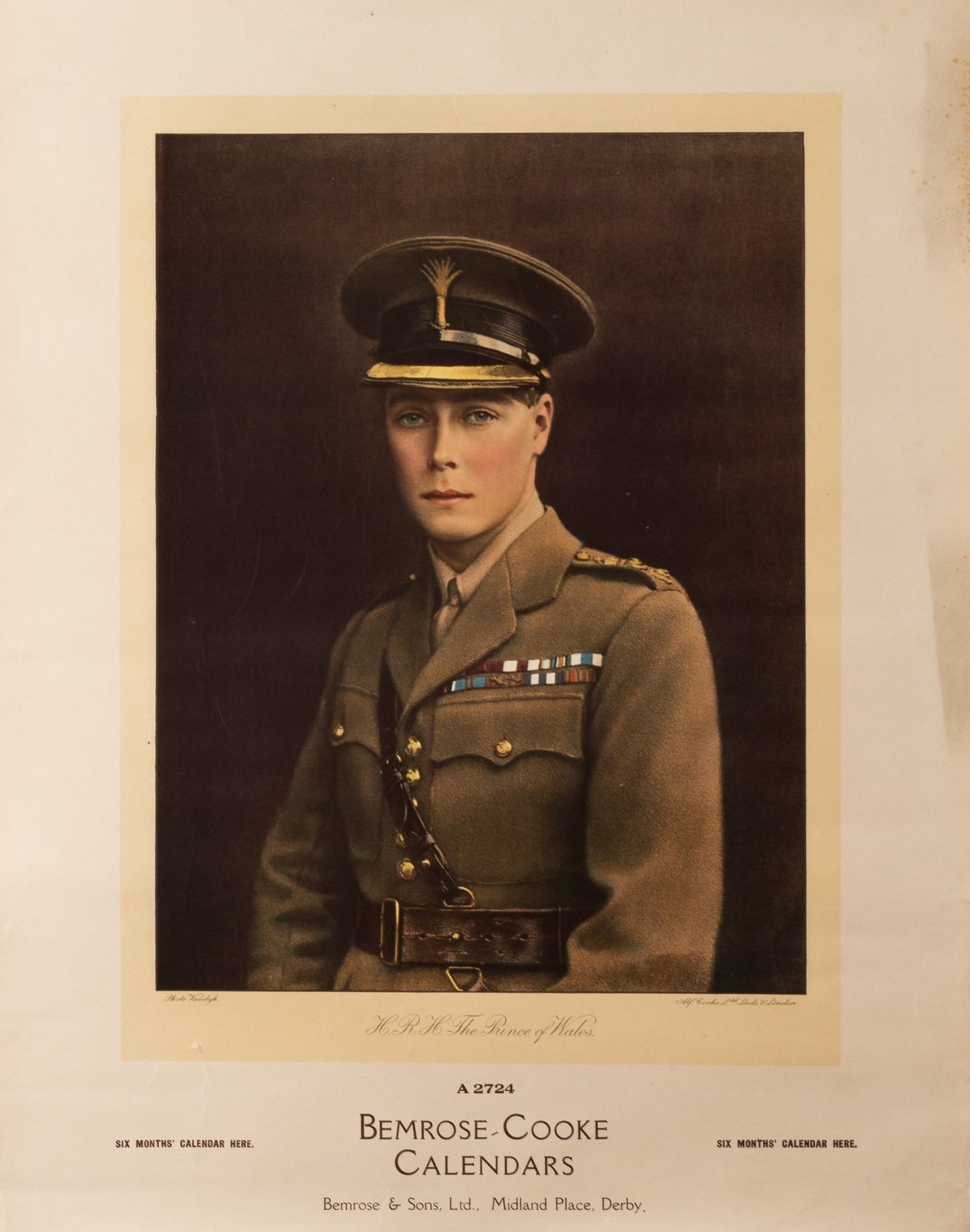 Calendar showing a portrait of HRH Prince of Wales, later Edward III who abdicated the throne, Bemrose-Cooke Calendars, Alf Cooke, Ltd., likely WWI, approx. 25 x 20 inches. Creases and sunning on left edge.
