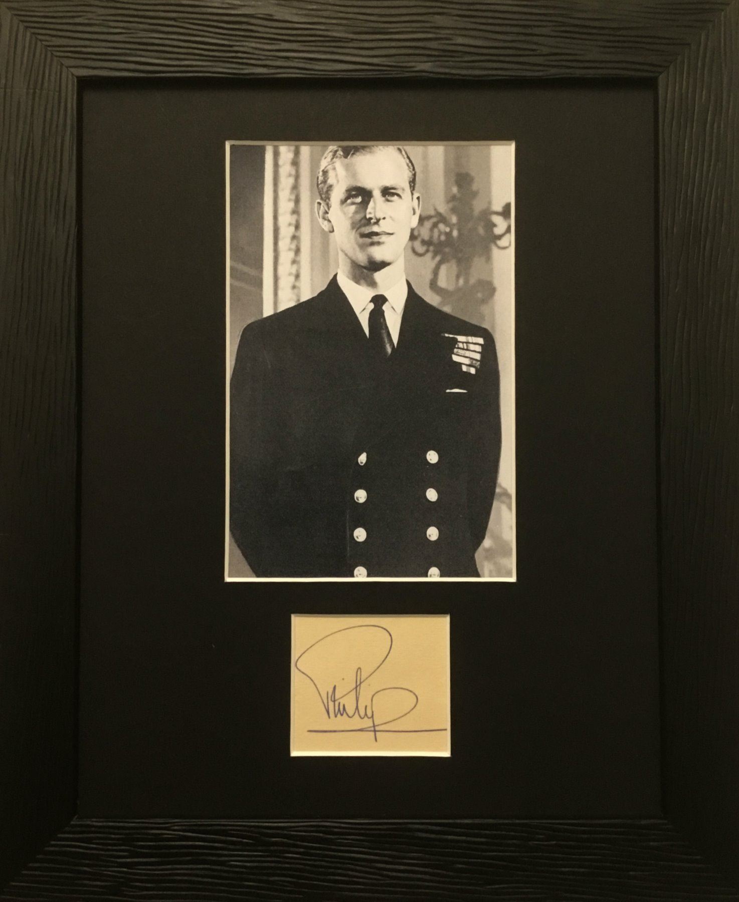 Prince Philip autograph, mounted and framed in a wooden frame.
