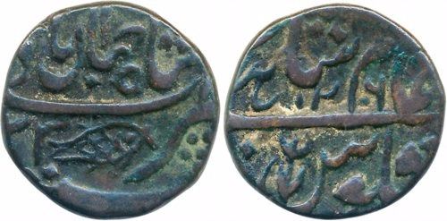 Copper Paisa, 8.23g, Pseudo mint name Shahjahanabad, in the name of Shah Alam II, AH 1206/ RY 33, Fish to right (KM# 3). Extremely fine for type, rare.
