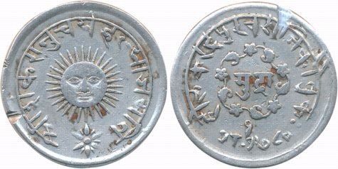 Tukoji Rao II, Silver Nazarana Mudra, 11.13g, SE 1780, Obv: Shri Shankaranucharya ahlya Jayati around Sunface, Rev: Mudra encircled by legend in Devanagari Holakarendra Puravaraji Kautukah Saka 1780 (KM# 15). Deep test mark on edge, cleaned, very fine, very rare.