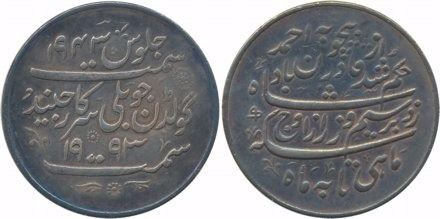 Ranbir Singh, Silver Nazarana Rupee, 11.39g, "50th anniversary of Ranbir Singh's reign", VS 1943- 1993, Persian legend on both sides (KM# X# M1). Toned, uncirculated, very rare.