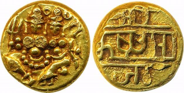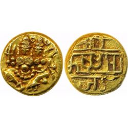 Krishna Raja Wodeyar, Gold Pagoda, 3.40g, Obv: Lord Shiva and Parvati, Rev: Devnagari Legend "Sri Krishna Raja" (KM# C210). Very fine.