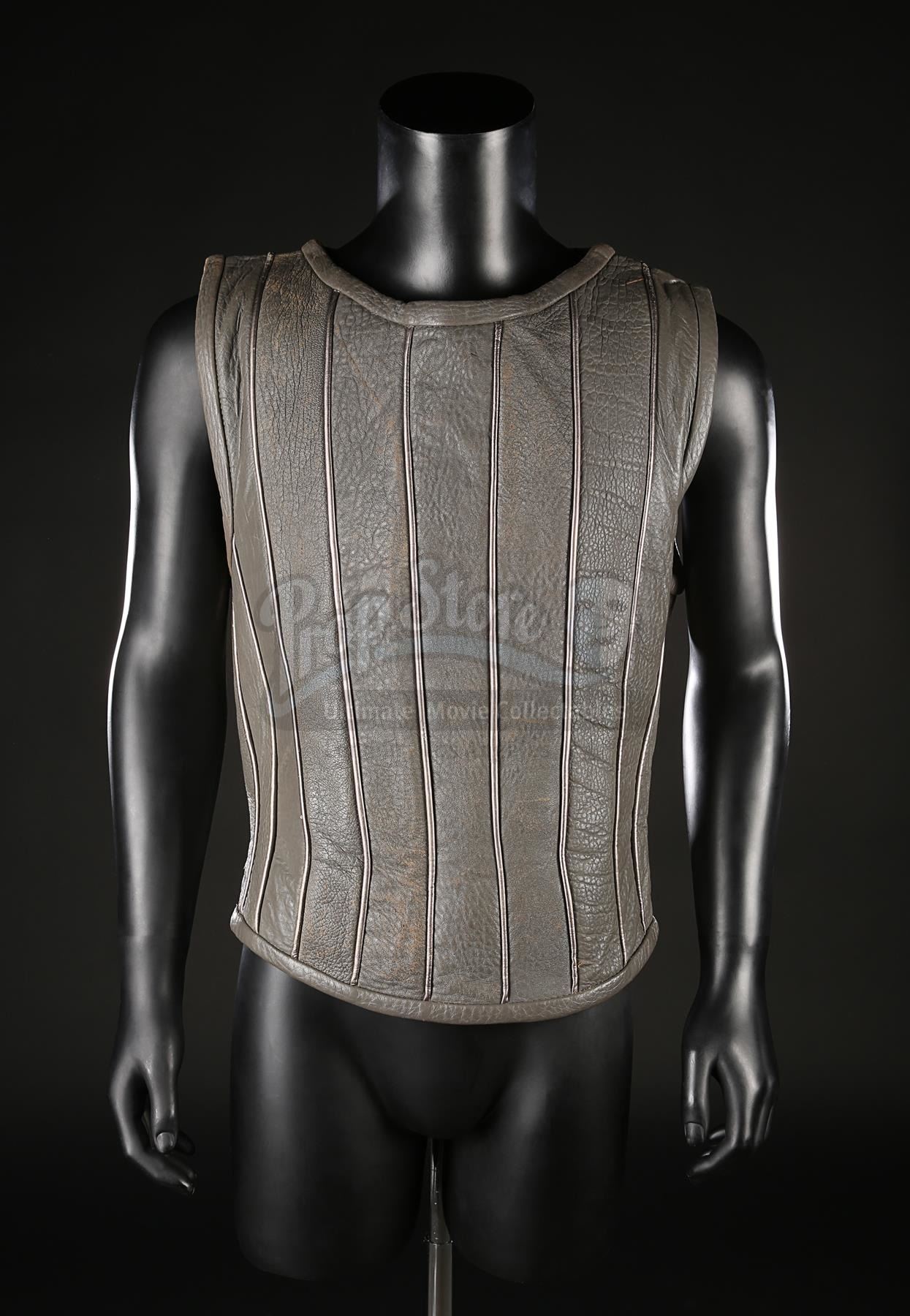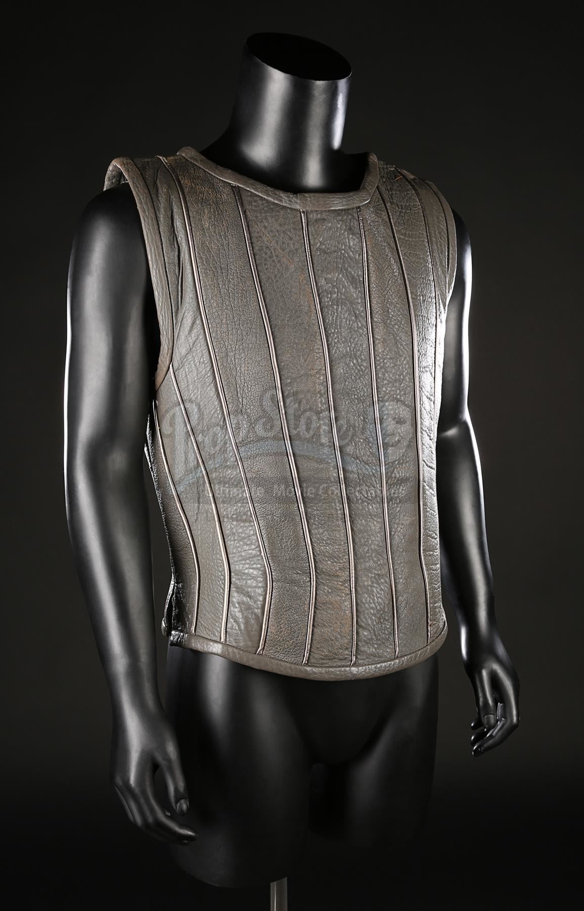 The tunic is constructed from grey leather and features lines of silver-coloured boning throughout. The interior consists of black felt lining. The back of the tunic laces together with a black leather thong fed through metal eyelets. It shows age and production use throughout, including leather wear, small holes and creases, while the bottom eyelet on the reverse remains loose.