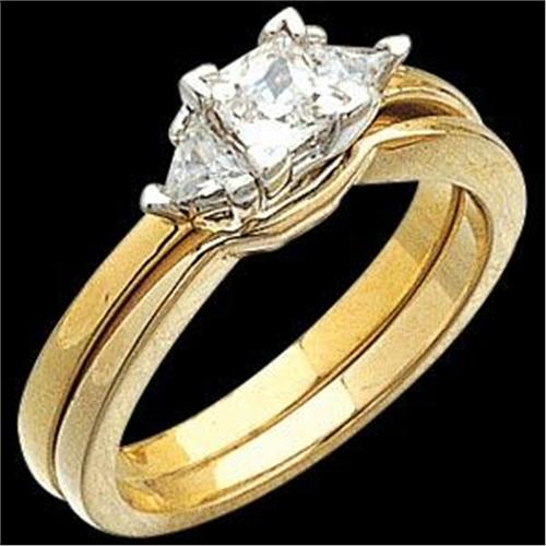 14k Yellow Gold PRINCESS Cut Diamond Engagement Ring with a matching 14k Yellow Gold Wedding Band! The Princess Cut Diamond has a triangular, 'kite' shaped Diamond set each side. The Diamonds are all Fine 'VS' Clarity and Fine 'H', with a Total Weight= .50 CARATS! The Engagement ring and Wedding Band are a size 6 and I can resize them for you. This is an Exquisite Diamond Engagement Ring and Wedding Band!!