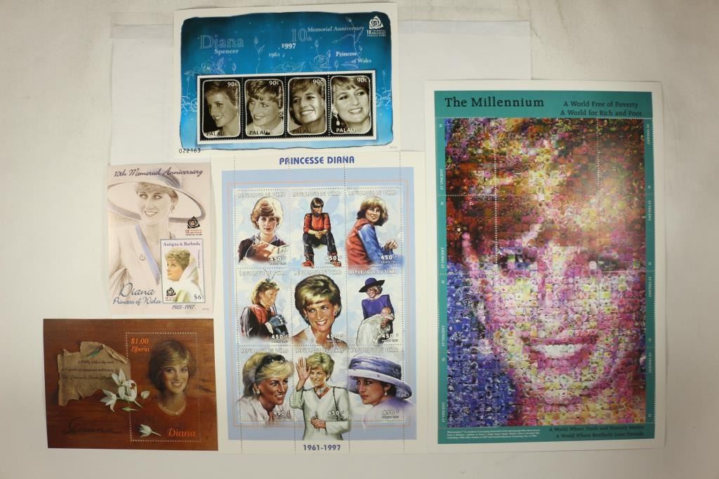 STAMPS. ANTIGUA SKETCHES OF DIANA, CHAD, LADY WITH A SMILE, LIBERIA MINT SOUVENIR SHEET, PALAU MINT SHEET OF 4 AND ST. VINCENT