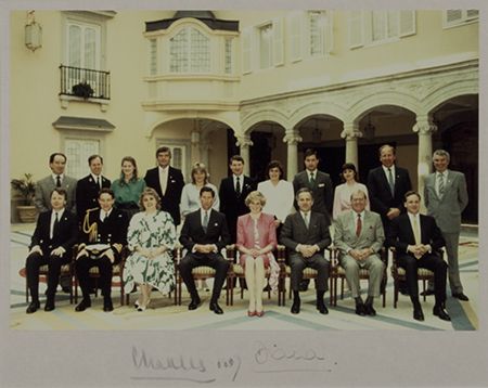 S.P. 10" x 7 3/4 (sight) " color signed by both "Charles 1898" and "Diana" on the lower mount, a formal group photograph with Charles and Diana seated front and center and surrounded by 17 others, one in military dress. Likely shot shortly after their marriage. Signatures just a tad faded, else fine. Nicely matted and set in a frame with frosted glass.