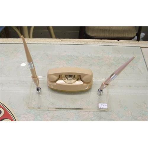 This is a unique desk set that I have never seen. It is the princess phone on a lucite base with 2 Waterbury Pens. The pens are ball point so you can get refills for them. The set is in excellent condition except the lucite is scratched but not to noticable when it is sitting and measures 7" X 3 1/2".