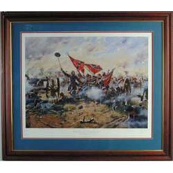PRINT BY DON TROIANI. Dramatic print of historic depiction of the final Confederate charge at Gettysburg. Title (The High Water Mark). Brig. Gen. L.A. Armistead leads his men momentarily through the Union lines. Nicely framed in a triple front along with colored framing. This #36 of an edition of 75, and it is signed by Troiani in the lower right. IMAGE SIZE: 28" w x 22-3/4" h. CONDITION: Generally excellent, some minor scuffing on the frame. 4-50133