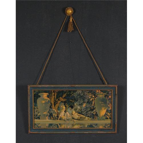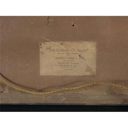 COLOR PHOTOLITHOGRAPH 9 1/4'' x 17 1/2''. Maxfield Parrish (1870-1966), NH. ''The Garden of Allah''. Placed in a blue vintage frame with gilt detailing and vintage woven picture hanger, rubbing on frame, as seen. Parrish's wildly successful romanticized images are an icon of the American culture.