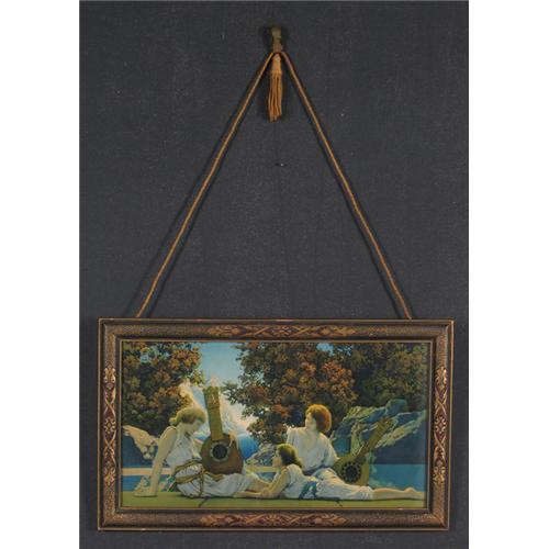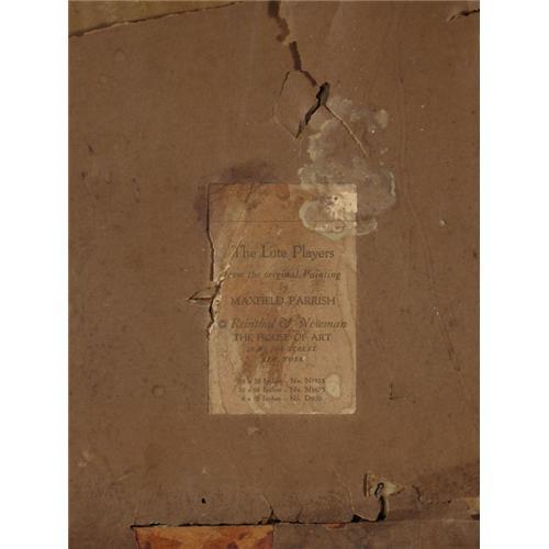 COLOR PHOTOLITHOGRAPH 9 1/4'' x 17 1/2''. Maxfield Parrish (1870-1966), NH. ''The Lute Players''. Placed in a vintage frame with gilt detailing and vintage woven picture hanger (missing circular piece), rubbing on frame, as seen. Parrish's wildly successful romanticized images are an icon of the American culture.