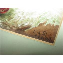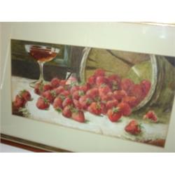 PRINT OF STRAWBERRY STILL LIFE. Depicts overturned basket of strawberries on table with glass of wine. Signed in lower right "E.A.S. Aug. '03". Framed and matted. 22.5" x 15" framed.