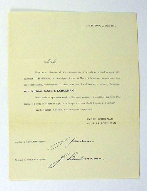 [Schulman, J.]. PRINTED ANNOUNCEMENT LETTER. Amsterdam, 20 Mars 1914. Single sheet folded in half to comprise four pages. Printed on first page, signed in type and autographed in ink by André Schulman and Maurits Schulman at base. Folded size, 28 by 22 cm. Fold marks. Fine. "Nous avons l'honneur de vous informer que, è la suite de la mort de notre père Monsieur J. Schulman, les soussignés André et Maurits Schulman, depuis longtemps, ses collaborateurs, continueront è la date de ce jour, les affaires de la maison J. Schulman sous la raison sociale J. Schulman. Nous espérons que vous voudrez bien nous continuer la confiance que vous avez accordée è notre cher père et soyez assurés, que tous nos efforts tendront à la justifier." Ex George F. Kolbe library.